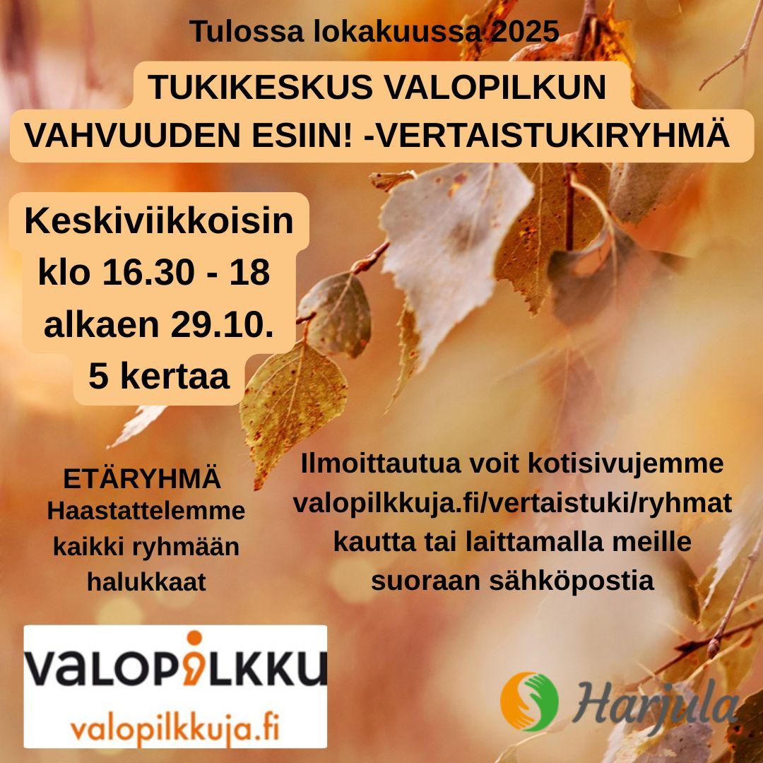 Valopilkun Vahvuudet esiin! - vertaistukiryhmä alkaa syyskuussa 2025. Voit ilmoittautua kotisivujemme ilmoittautumislomakkeen kautta, tai laittamalla meille sähköpostia. Kaikki ryhmään haluavat…