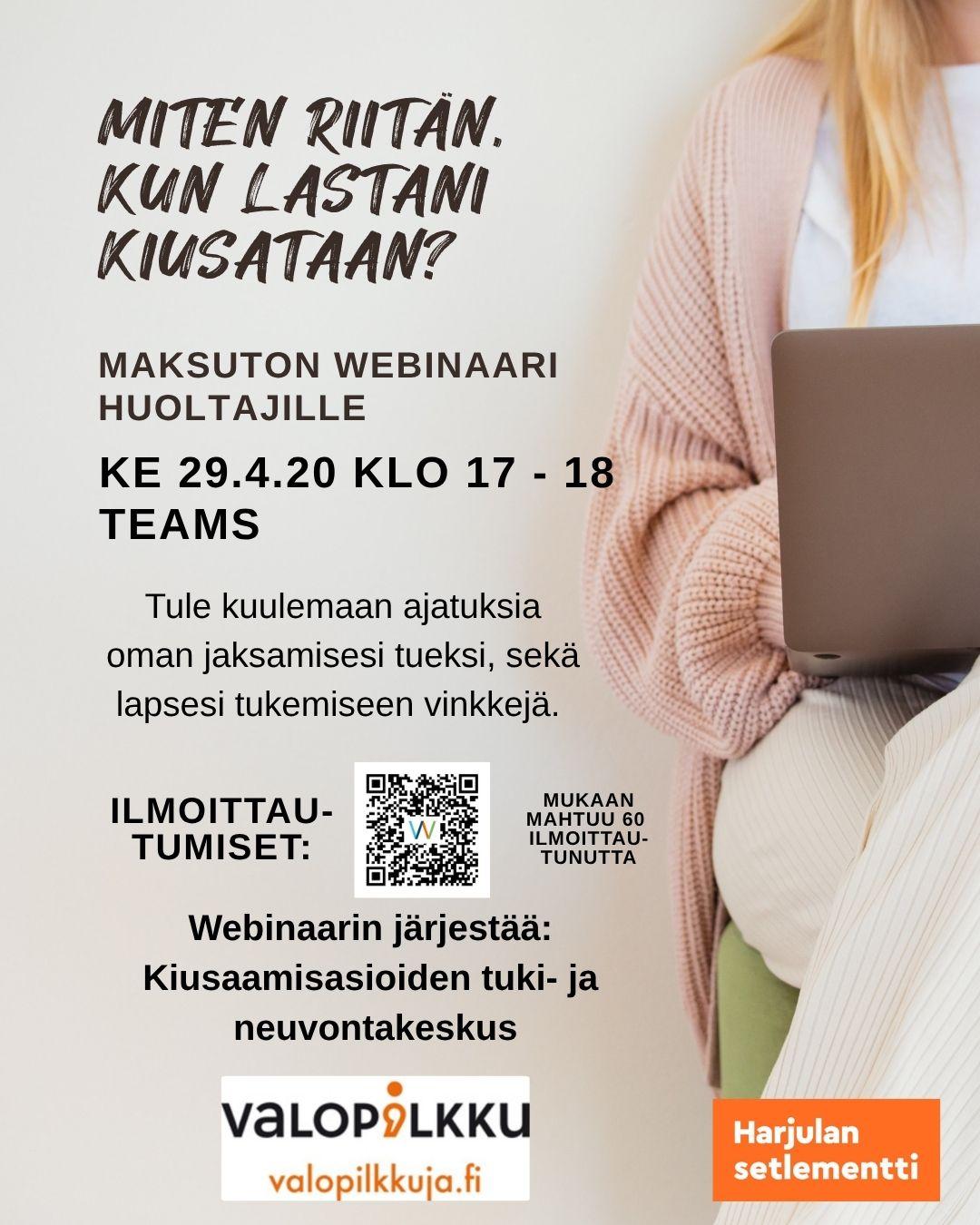 Kiusaamisasioiden tuki- ja neuvontakeskus Valopilkku järjestää maksuttoman webinaarin, Miten riitän, jos lastani kiusataan huoltajille ja muille asiasta kiinnostuneille, jotka haluavat tukea ja ymmärrystä vaikeaan tilanteeseen.